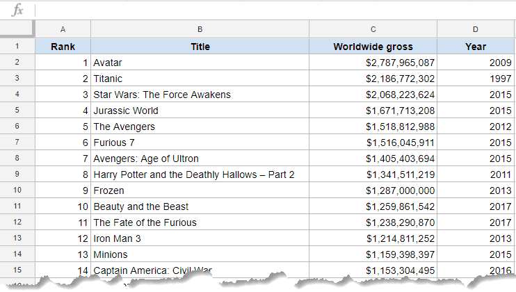 For the purpose of this tutorial, I am using the dataset of highest-grossing Hollywood movies. I got the for this from Wikipedia (of course!). Note that the gross collections are not adjusted for inflation (so don't be appalled when you see 'Spiderman 3' and 'Fate of the Furious' in the list).